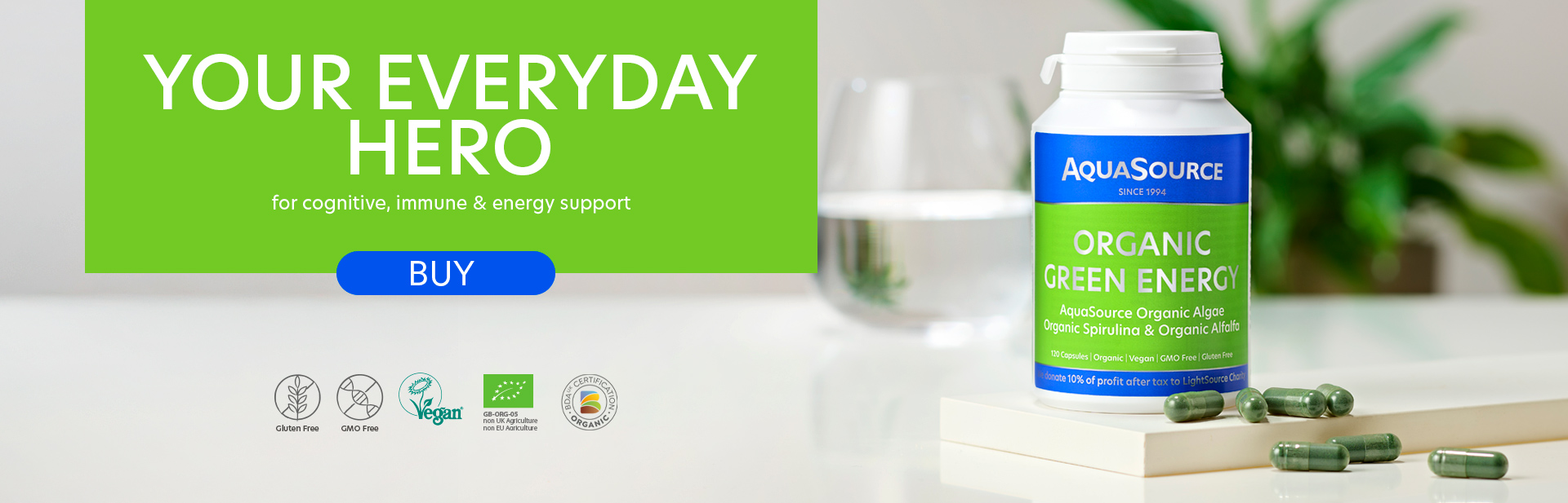 AquaSource Organic Green Energy combines three natural source ingredients: AquaSource Organic Algae Superfood, Organic Spirulina, and Organic Alfalfa Juice Powder that are designed to help promote optimal energy levels as well as support your immune system and normal cognitive function.